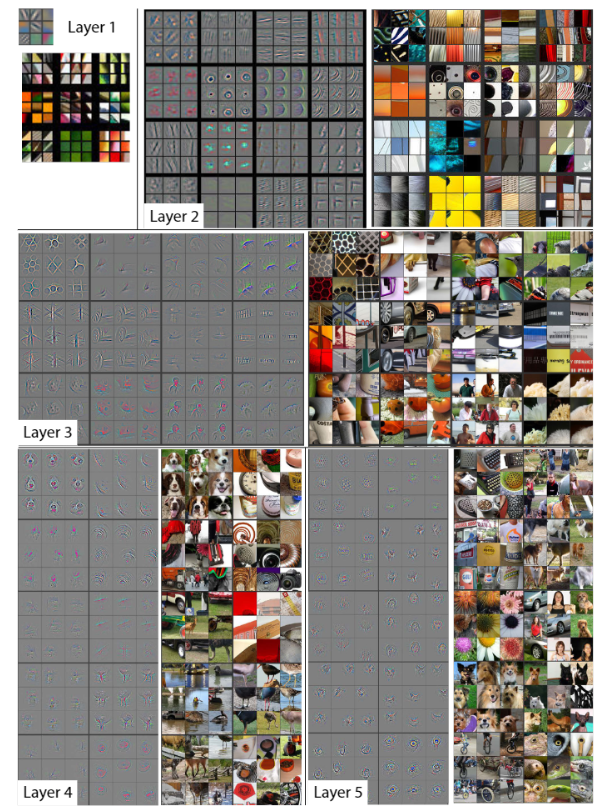 不断经历上述过程,将特征映射回输入所在的像素空间,就可以呈现出人眼可以理解的特征。给定不同的输入图像,看看每一层关注到最显著的特征是什么,如下图所示: