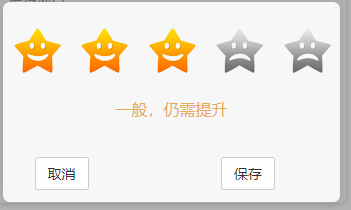 var aSpan = document.getElementsByClassName("star")[0]; var aStxt = document.getElementById("starTxt"); var aBstar = aSpan.getElementsByTagName("b"); var arrBtxt = ["很差,亟需改进", "较差,有待提高", "一般,仍需提升", "良好,比较满意", "优秀,非常满意"]; var num = 0; var onOff = true; for (var i = 0; i < aBstar.length; i++) { aBstar[i].index = i; //鼠标点击 aBstar[i].onclick = function () { onOff = false;//开关为假就不执行鼠标移除的代码 //先清空 aStxt.textContent = ""; for (var i = 0; i < aBstar.length; i++) { aBstar[i].setAttribute("class", "ic-star-off"); } //点击当前星星,之前的都点亮包含自己 num = this.index; aStxt.textContent = arrBtxt[num]; $("#starLevel").val(num + 1); vm.starLevel = num + 1;//需要提交到后台的星级 for (var i = 0; i <= this.index; i++) { aBstar[i].setAttribute("class", "ct-star"); } }; }