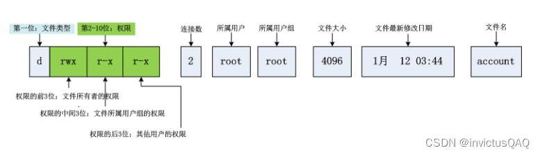 可以发现文件前面有一串字符,它代表的其实就是文件的类型和访问权限,具体内容如下。