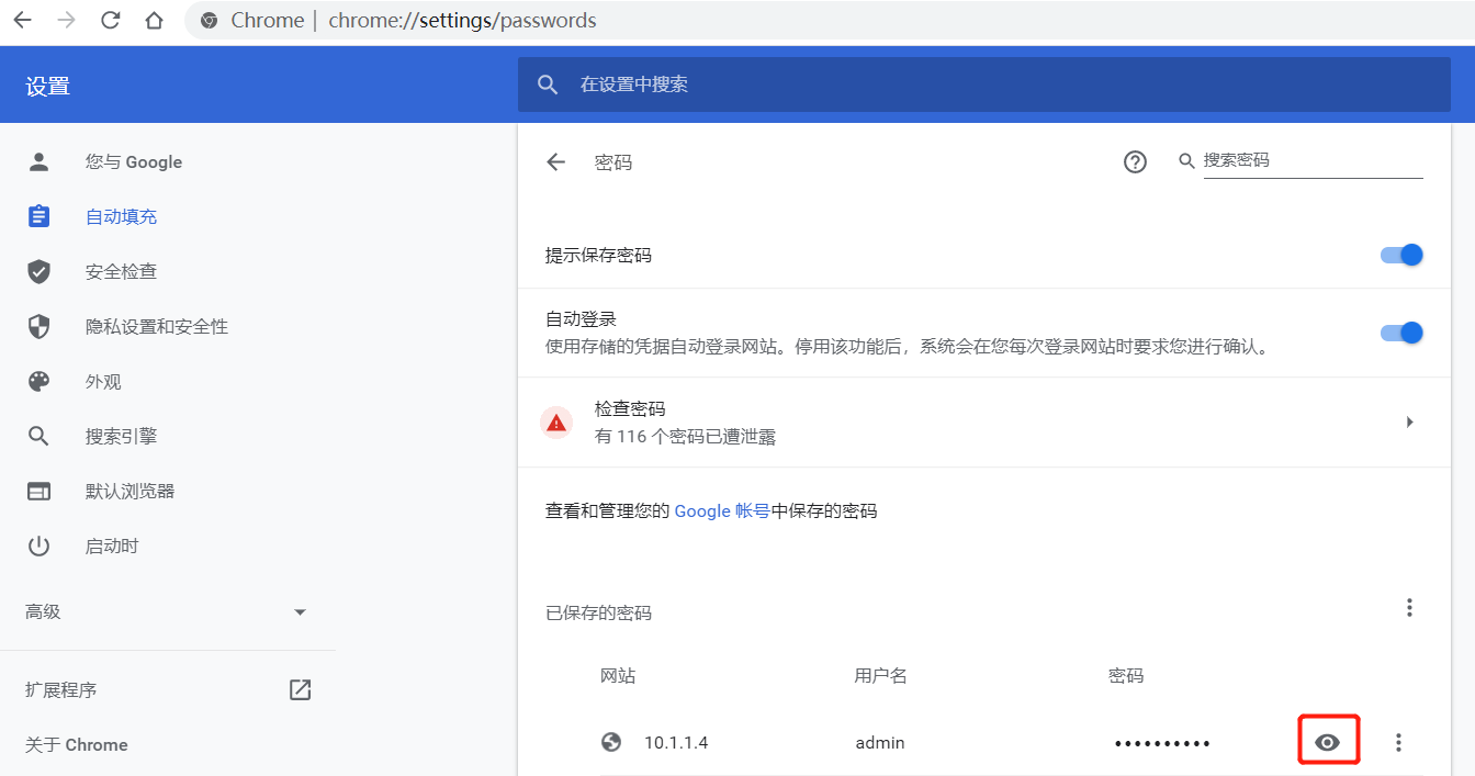 如何查看浏览器保存的账号密码1、点击chrome浏览器右上角的三个点,选择【设置】 2、选择密码3、点击小眼睛,输入电脑密码即可查看版权声明:本文为yangyun_1999原创文章,遵循CC 4.0 BY-SA版权协议,转载请附上原文出处链接和本声明。原文链接:https://blog.csdn.net/yangyun_1999/article/details/115208450