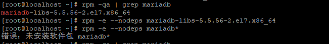 rpm -e --nodeps 文件名------强制卸载mariadb(-e为卸载。添加--nodeps为不检测以来卸载,也就是强制卸载)