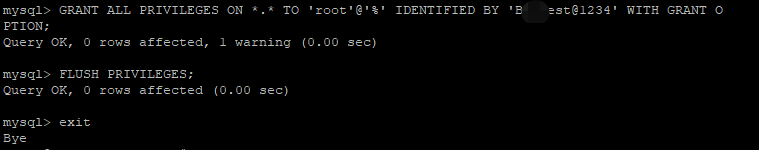 mysql> GRANT ALL PRIVILEGES ON *.* TO 'root'@'%' IDENTIFIED BY 'B***est@1234' WITH GRANT O PTION;