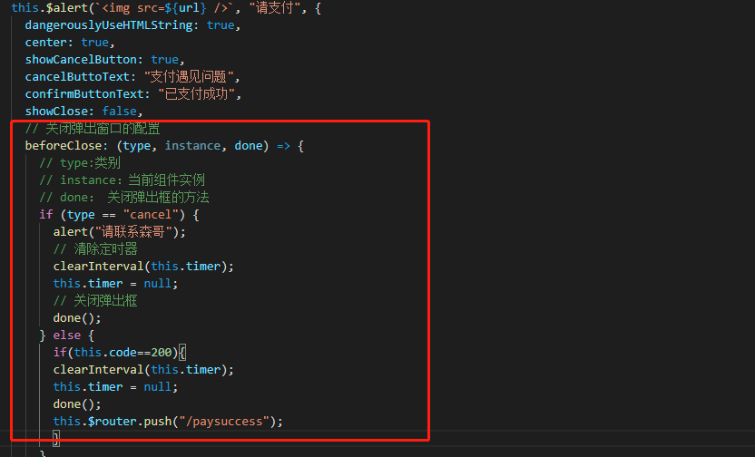 },在open函数中,我们先定义一个定时器timer,先在data中定义为null,然后根据返回的结果判断是否跳转到支付成功页面。