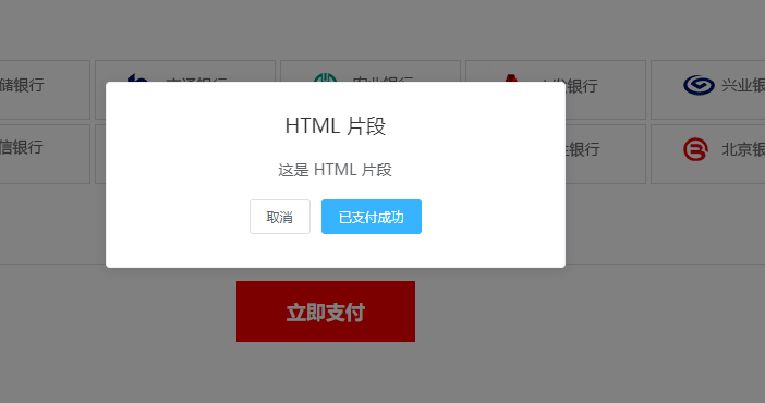 this.$alert("<strong>这是 <i>HTML</i> 片段</strong>", "HTML 片段", {