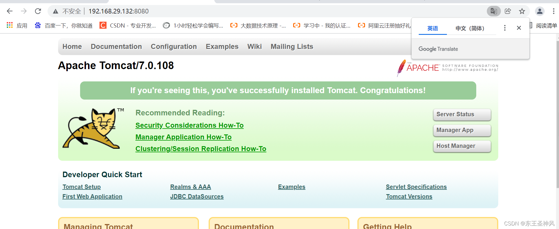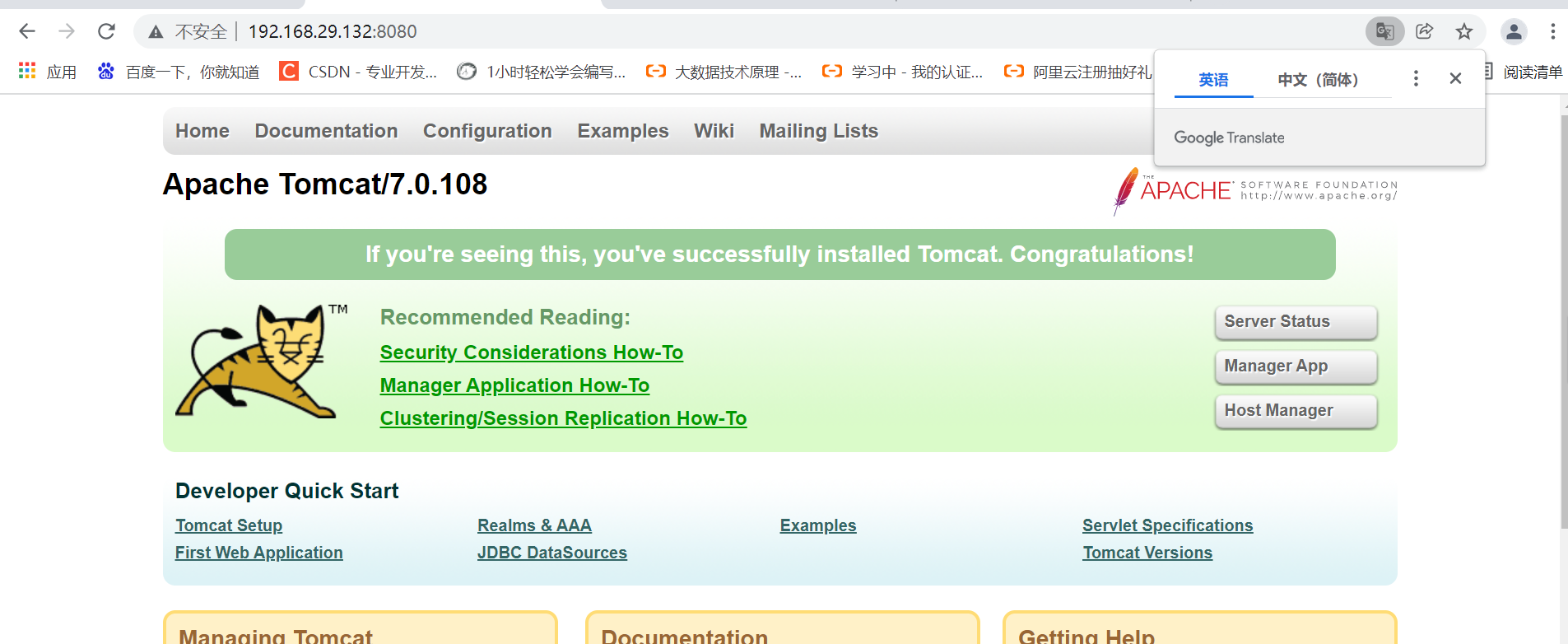 10:最后确保访问成功,重启下tomcat .(先 shutdown.sh ,再 startup.sh). 打开浏览器输入 服务器Ip加8080访问.出现tomcat 猫 即代表部署成功. 然后可以在webapps 目录下部署项目,同理地址加项目名访问.