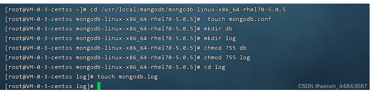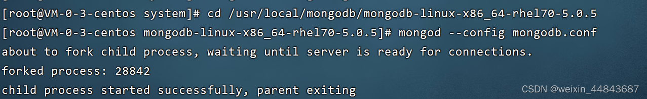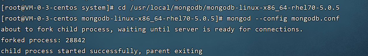 [root@VM-0-3-centos mongodb-linux-x86_64-rhel70-5.0.5]# mongod --config mongodb.conf