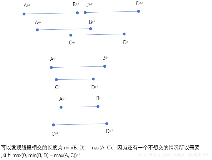计算二维平面的两个矩形的面积交集实际上是可以转换为一维线段的交集来解决的,下图是一维线段的并集:
