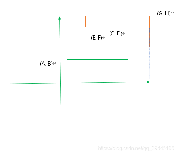 二维平面对应线段的交集的乘积就是两个矩形的面积交集,如下图所示,实际上是二维平面的线段在坐标轴上的投影这样就可以转换为一维线段来解决,也就是可以对应上面的一维线段的交集