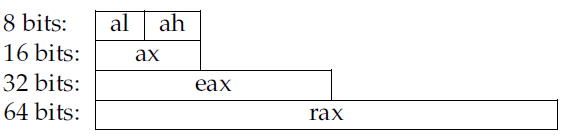 随着处理器从8位一直扩展到64位,有一些寄存器还能拆分使用。rax的低八位是一个8位寄存器al,接下来的8位称为ah。如果把rax的低16位组合起来就是ax寄存器,低32位就是累加器eax,整个64位才是rax寄存器。这样设计的目的是向前兼容,具体可以参考下图: