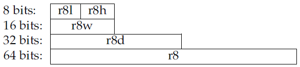 为了简化描述,我们还是着重讲64位寄存器。但是,大多数编译器支持混合模式:一个字节可以表示一个布尔型;32位对于整数运算就足够了,因为大多数程序不需要大于2^32以上的整数值;64位类型常用于内存寻址,能够使虚拟地址的空间理论上可以达到1800万TB(1TB=1024GB)。