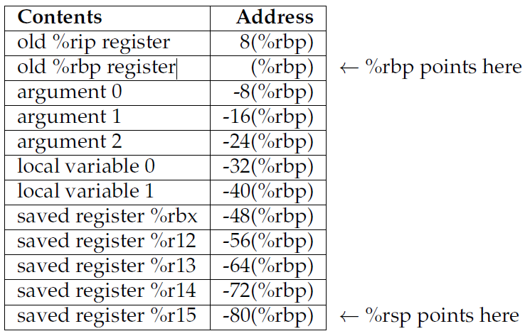 构建一个合法栈帧的形式有多种,只要函数使用栈帧的方式一致即可。比如,被调函数可以首先把所有的参数和需要保存的寄存器压栈,然后再给局部变量分配栈空间。(当然了,函数返回时,顺序必须正好相反。)