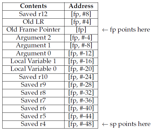 还有一种常用的方式就是,在将参数和局部变量压栈之前,为被调函数执行PUSH {fp,ip,lr,pc},将这些寄存器压入栈中。尽管这不是实现函数的严格要求,但是以栈回溯的形式为调试器提供了调试信息,可以通过函数的调用栈,轻松地重构程序的当前执行状态。