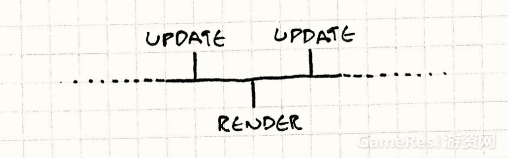 你看到了,我们的更新操作很紧凑,间隔固定。然而我们的渲染却不一样,比更新频率要低,并且不稳定。这样也还好。令人不爽的是渲染并不一定跟更新在一起。看一下第三次渲染。它正好在两次更新之间: