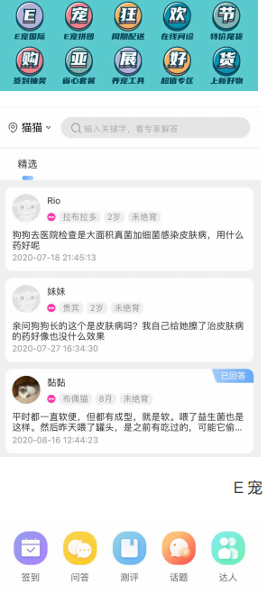 E 宠:在线问诊功能位于图标导航栏的第⼀排,点进去进⼊第⼆级⻚⾯,左上⻆切换宠物,并排是搜索框,底部为精选问答,会显示⽤户遇到的宠物⽅⾯的问题。