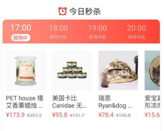 今⽇秒杀:在商城⻚⾯的第⼀眼显示区域,以板块的⽅式呈现,不同时段(整点)的商品秒杀。