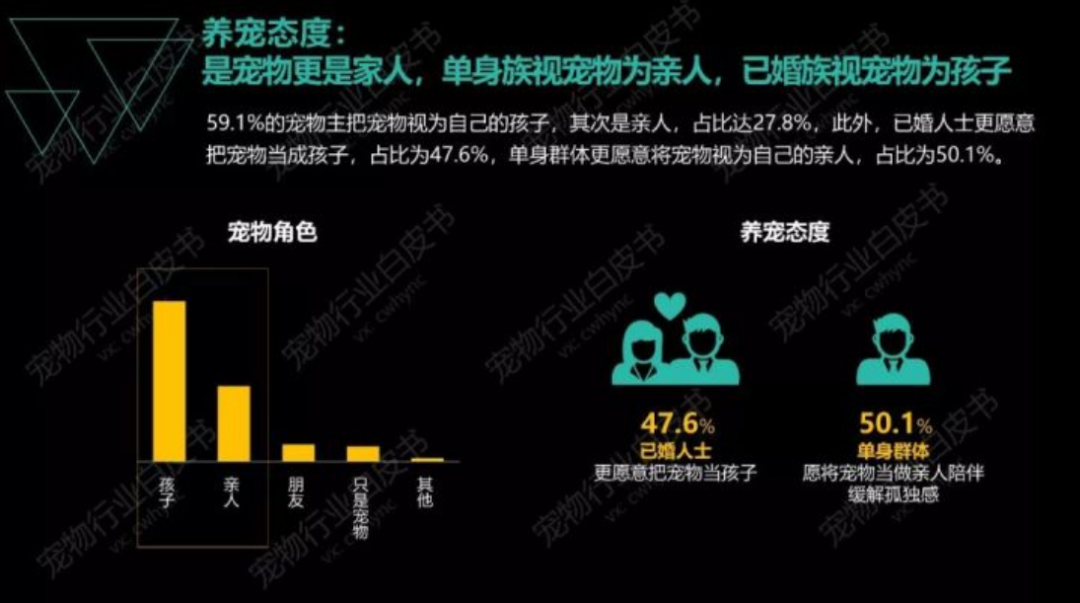 通过分析可以看出,87.9%的⽤户将宠物视为⾃⼰的孩⼦和亲⼈。既是出于对宠物单纯的喜欢和热爱,也是缓解孤独,作为陪伴的⼀种精神寄托。