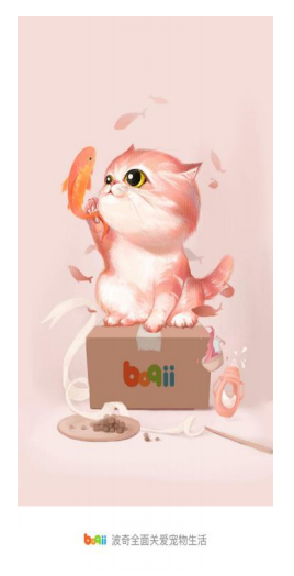 波奇宠物:波奇宠物的启动⻚,背景是粉红⾊,⼀条⼩猫坐在纸箱上,去抓⼀条⼩⻥。纸箱上是波奇宠物的名称,底部是波奇的 Slogan。