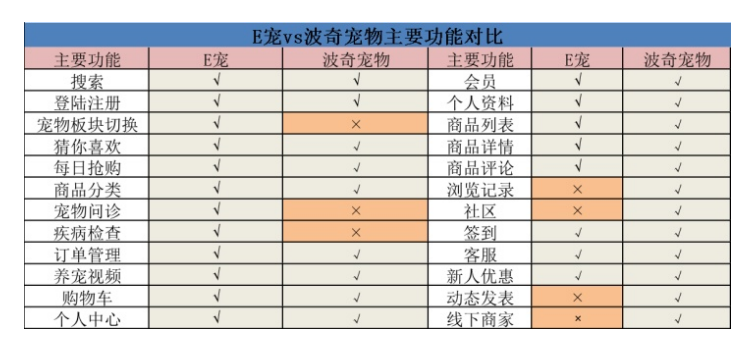 E 宠商城是⼀个“购物+咨询”的电商的平台,⽽波奇宠物是⼀款“购物+社交”的电商平台,因此,这两款在购物功能上基本上是相同的,只是在其他地⽅的功能不⼀样。