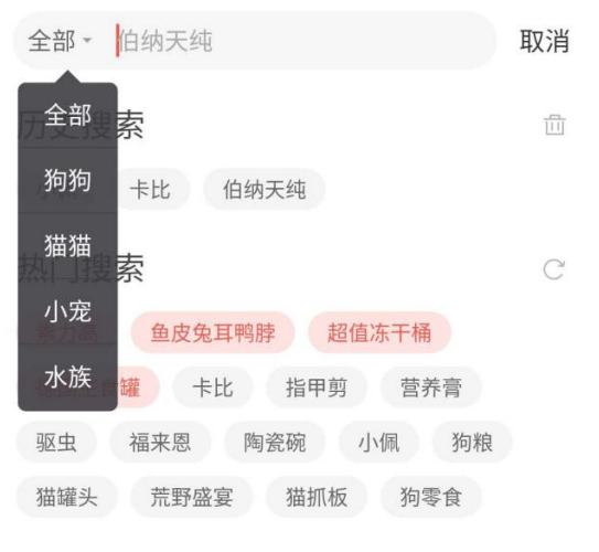 波奇宠物:上中下结构,顶部为搜索框+取消搜索按钮,可以选择搜索类型(狗、猫、宠、⽔族)。往下是搜索历史,可⼀键删除所有记录,再往下是热⻔搜索,热⻔搜索前 4 个关键词区别与其他关键词,每排关键词数量不⼀样,按关键词的⻓度来排版。