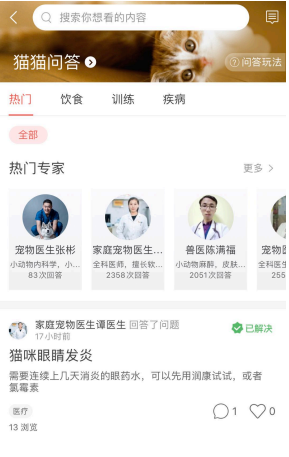 波奇宠物:问诊功能在波奇宠物 app ⾥⾯叫做问答,同样位于⾸⻚图标导航栏,位置醒⽬,进⼊第⼆级⻚⾯,顶部搜索框,下⾯为分类标签栏,中间部分为热⻔宠物医⽣推荐,底部为医⽣的解答。