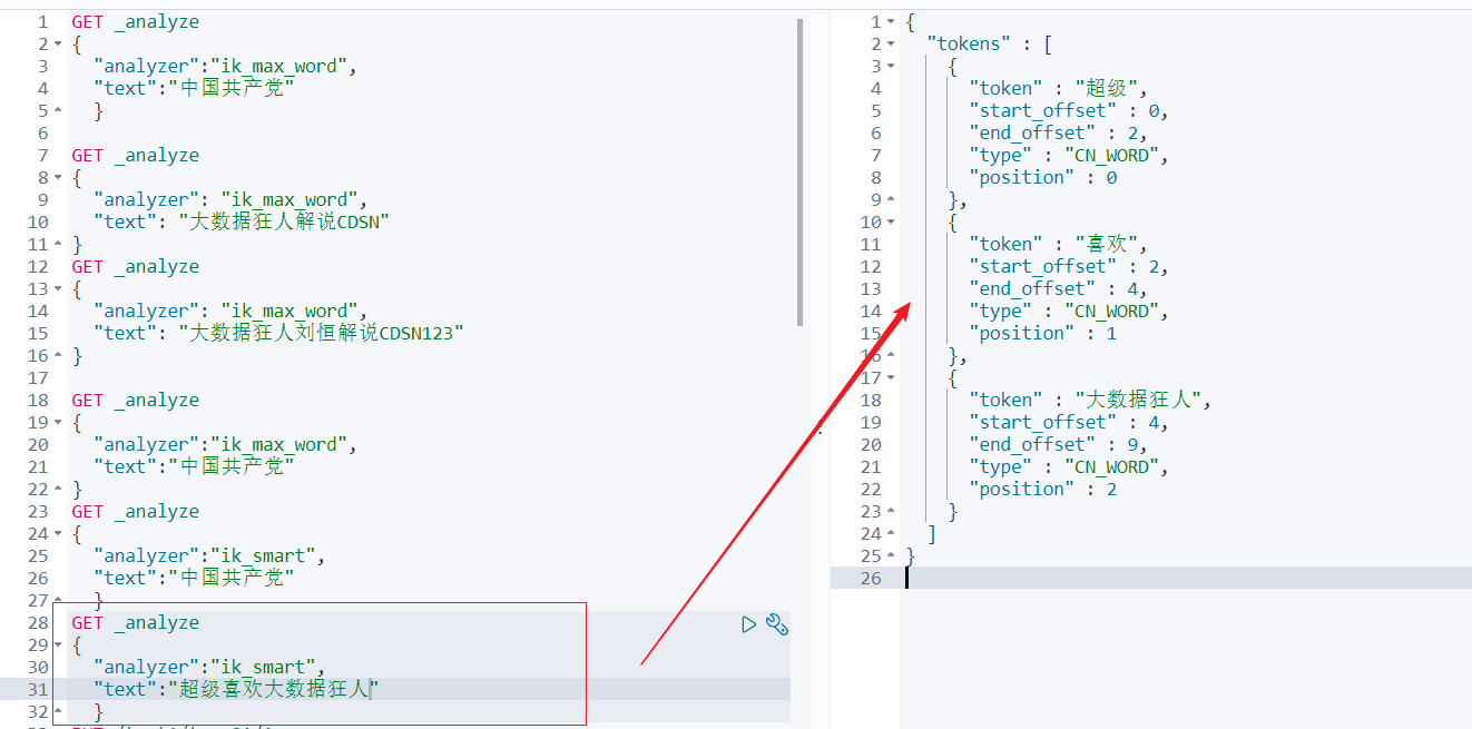 ik_smart:粗粒度分词,优先匹配最长词,只有1个词!