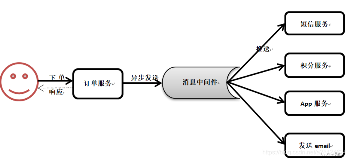 - 业务解耦,代码解耦:例如,订单业务需要发送短信、推送app通知信息、扣除会员积分、发送email等,如果把这些全部写在订单业务代码中,订单代码将会变得十分臃肿,不利于修改维护,事物管理十分麻烦,使用中间件就不会有上述问题。