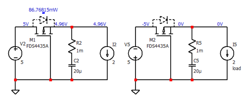 电源反接,寄生二极管截止,V G S = 0 V,PMOS关断,后级设备电压为0。