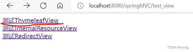 SpringMVC的视图 SpringMVC中的视图是View接口,视图的作用渲染数据,将模型Model中的数据展示给用户 SpringMVC视图的种类很多,默认有转发和重定向视图 当工程引入jstl的依赖,转发视图会自动转换成JstlView 若使用的视图技术为Thymeleaf,在SpringMVC的配置文件中配置了Thymeleaf的视图解析器, 由此视图解析器解析之后所得到的是ThymeleafView 1.ThymeleafView 当控制器方法中所设置的视图名称没有任何前缀,此时视图名称就会被SpringMVC配置文件中所配置的视图解析器解析,视图名称拼接视图前缀和视图后缀所得到的最终路径,会通过转发的方式实现跳转。 2.转发视图 SpringMVC中默认的转发视图是:InternalResourceView SpringMVC中创建转发视图的情况: 当控制器方法中所设置的视图名称以“forward:”为前缀时,创建InternalResourceView视图, 此时的视图名称不会被SpringMVC配置文件中所配置的视图解析器解析,而是会将前缀“forward:”去掉,剩余的部分作为最终路径通过转发的方式实现跳转 3.重定向视图 SpringMVC中默认的重定向视图是:RedirectView 当控制器方法中所设置的视图名称以“redirect:”为前缀时,创建RedirectView视图, 此时的视图名称不会被SpringMVC配置文件中所配置的视图解析器解析,而是会将前缀“redirect:”去掉,剩余的部分作为最终路径通过转发的方式实现跳转 代码测试: