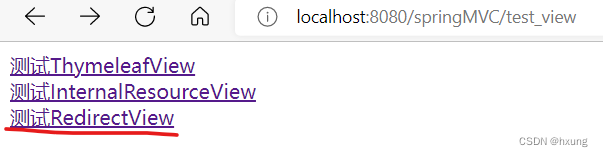 * 此时的视图名称不会被SpringMVC配置文件中所配置的视图解析器解析,而是会将前缀“redirect:”去掉,