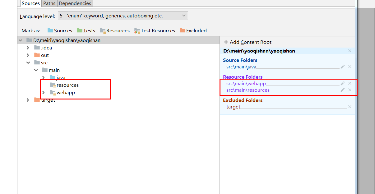 注意resources与webapp的文件夹标识是Resources的,如果不是需要手动添加为Resource