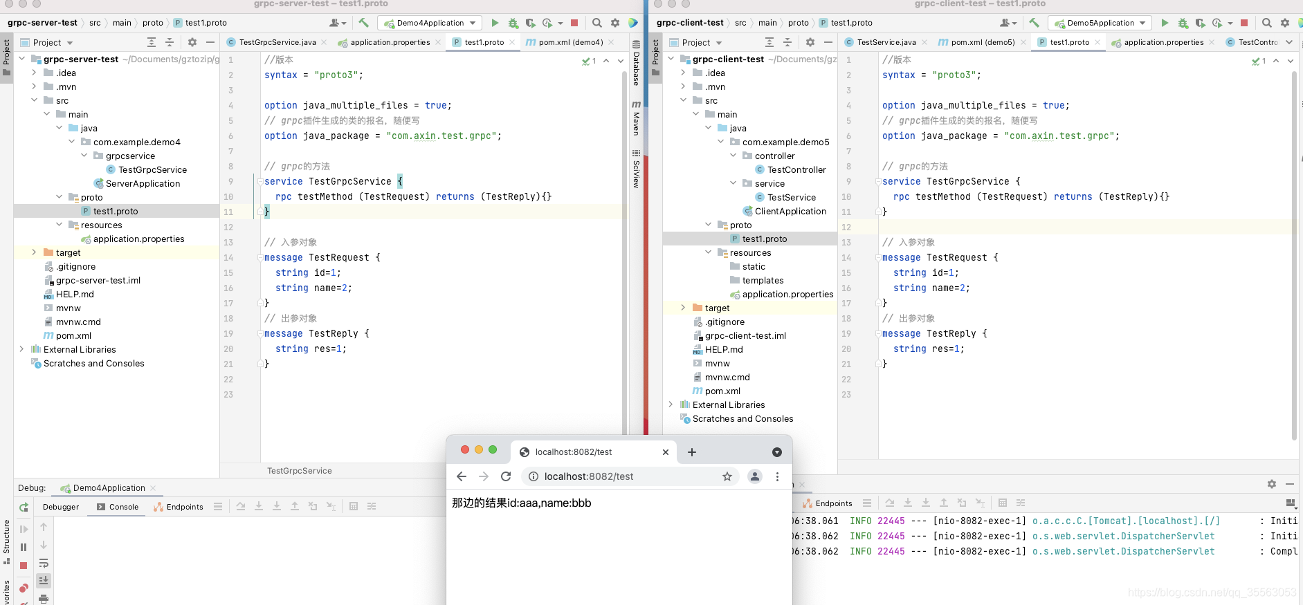 这个是运行的结果图片左侧是grpc的服务端,右侧是调用grpc的客户端,我的代码是拆成了两个SpringBoot项目,这样可能会方便大家理解。