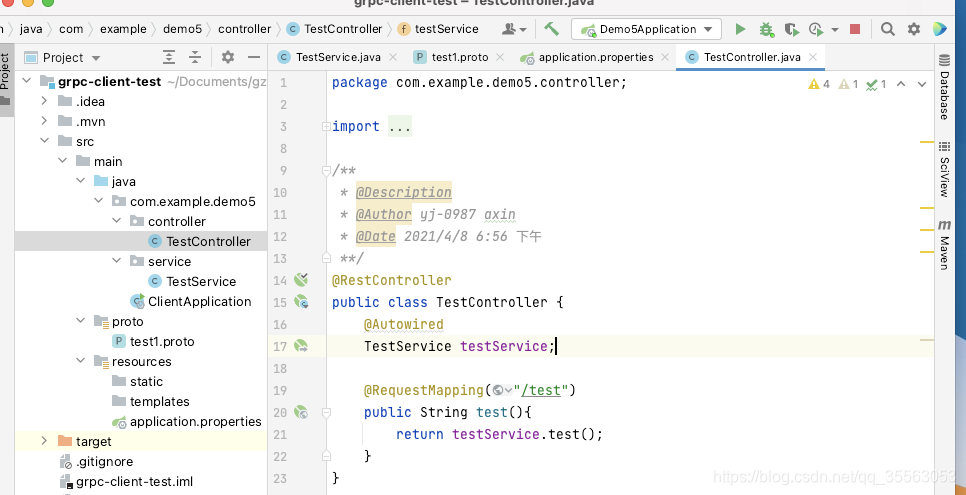 第三步、创建一个service来调用server端的服务,我的叫TestService,代码同样会报错,按照Server端的第三步中的图片,分别点击Lifecycle中的clean、Plugins下的protobuf中的protobuf:compile、Plugins下的protobuf中的protobuf:compile-custom即可