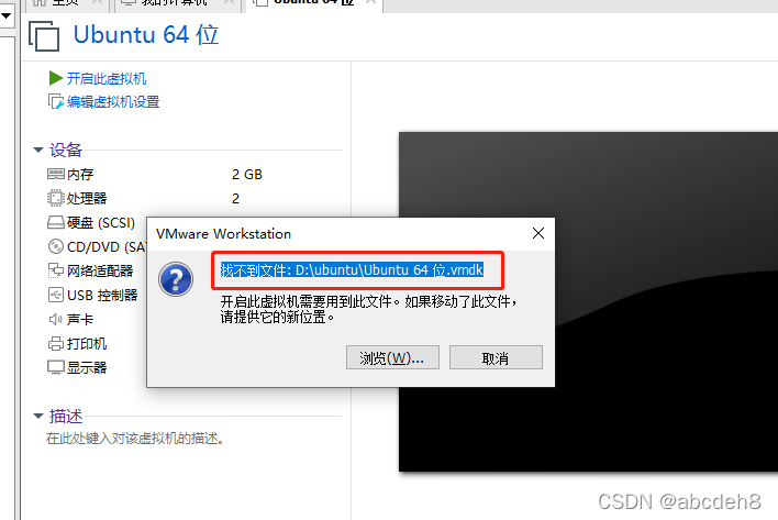 在VMware中打开ubuntu系统时会报“找不到文件: D:\ubuntu\Ubuntu 64 位.vmdk”。