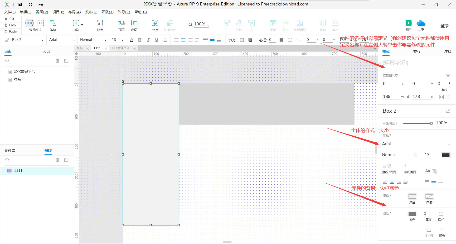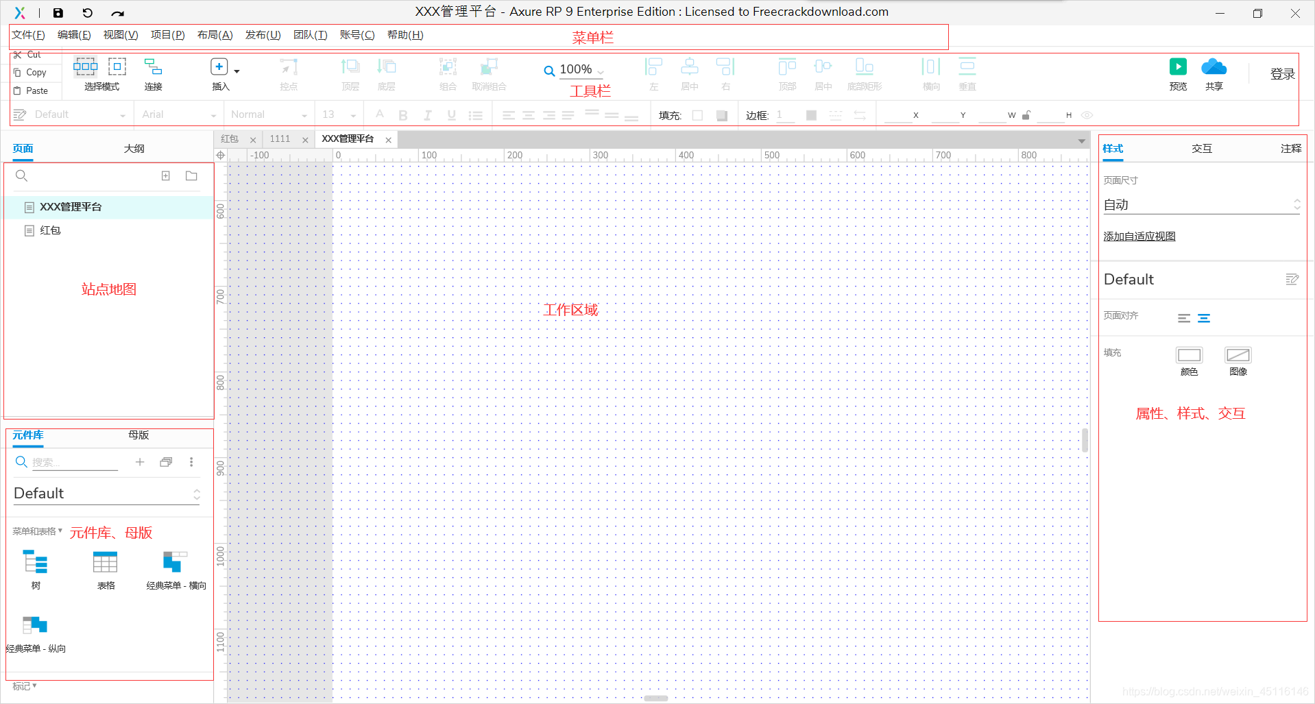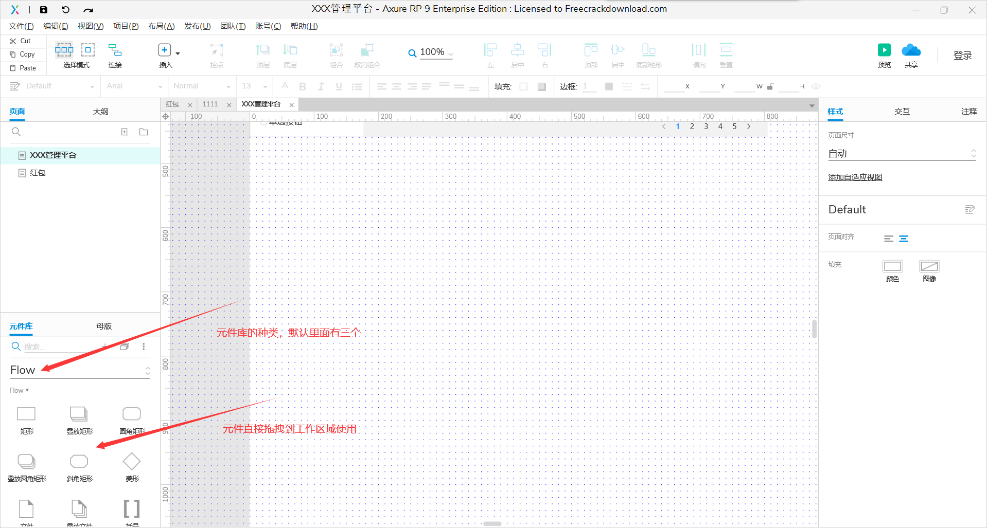 组件面板中包括有线框图组件和流程图组件两种类型,用这些组件可以进行线框图和流程图的相应设计。 这里显示的是所有的组件,后面的一部分是流程图组件 。系统默认显示的线框图类型的部件。