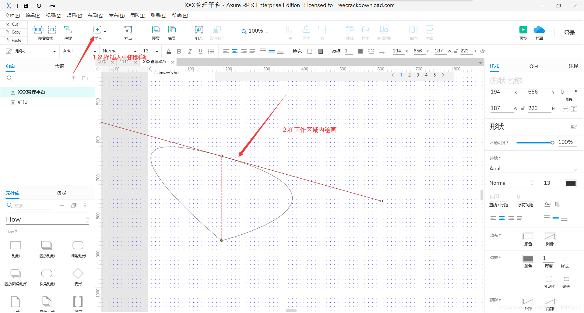 3.画曲线:当前点位置左键鼠标按住不动,方向影响到曲线的方向,橘色的线长度影响到曲线的半径