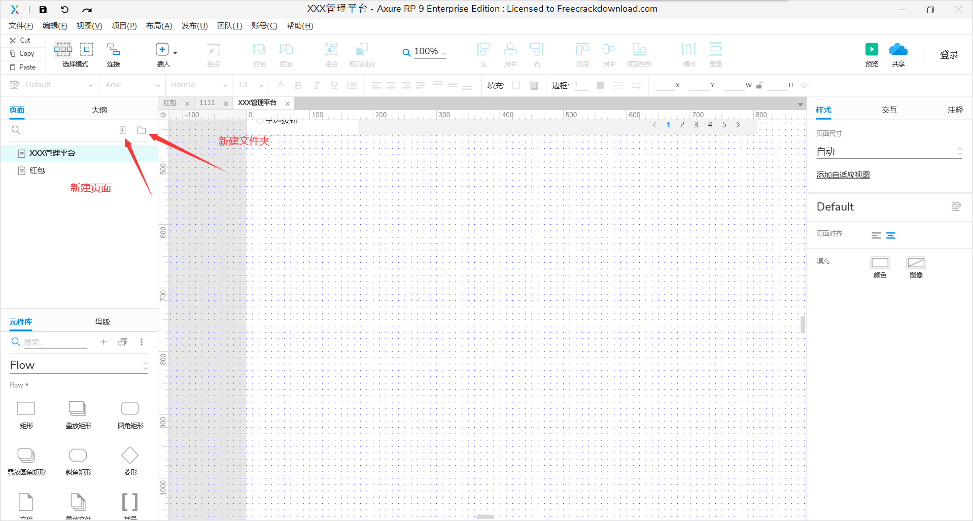页面是项目页面的导航面板, 在这里面可以对所有设计的页面进行添加、删除、重命名和组织等。