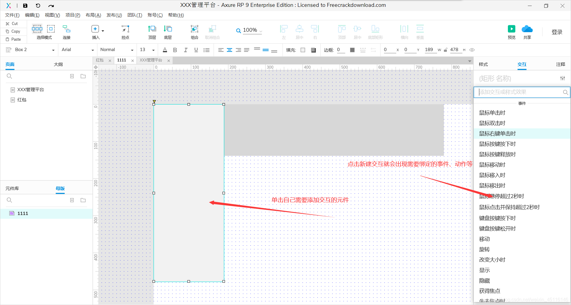 交互动作(带有逻辑性):选中元件,在右侧交互面板选择交互事件类型,设置动作。
