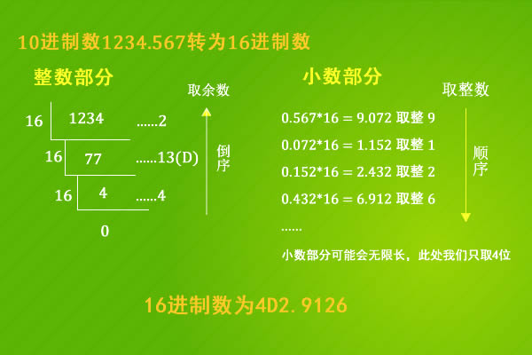 十进制小数转十六进制小数,整数部分方法为除十六取余再倒序,小数部分方法为乘十六取整,每次乘以相应之后基数后取结果的整数部分即可。需要注意的是并非所有的十进制小数都能完全转化为十六进制小数,这时就需要取近似值。