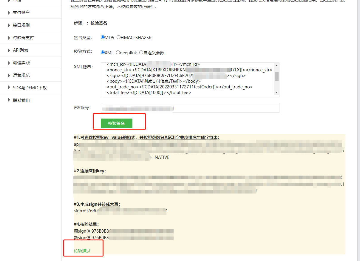 调用预支付订单,一直提示签名错误。微信支付的证书, api_key 已经设置完毕。然后,在微信的官方文档里,测试接口,没问题,但是在代码里就一直提示 签名错误。下图是官方文档调试的截图:
