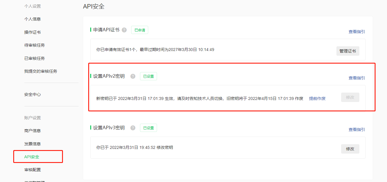 在商户平台的账户信息中更改API密钥(账户设置-安全设置-API安全), 15分钟后生效;(未解决)