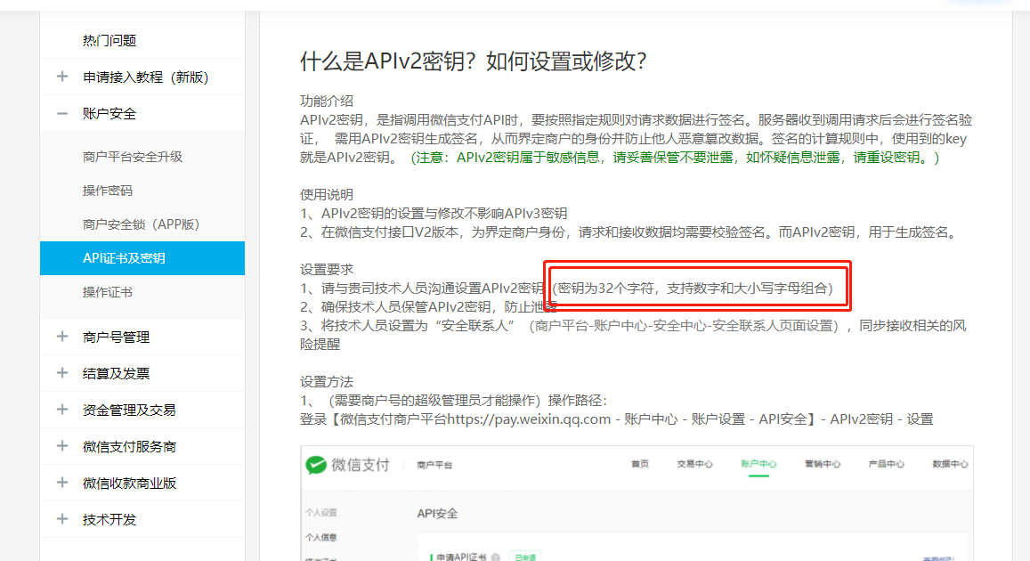 api_key 居然必须设置为32个字符,但是,这么重要的信息,居然没有任何特殊标注。最最恶心的是,在下面的设置页面,在输入api_key后,居然没有长度等校验,随便输入啥都行。然后数了一下自己的开始设置的key长度,果然不是32,而是34个字符。这绝对是微信的天大BUG。总结一句就是:设置密钥的地方不校验长度,但是代码调用接口的时候,就会校验。而且提示的错误是签名失败,不提示具体错误。耽误一整天,实在无力吐槽!!!记录下,警示后来兄弟!!