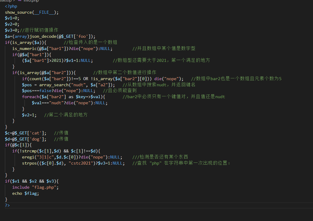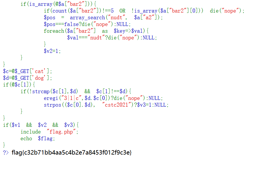 ?foo={"bar1":"2022a","bar2":[[],2,3,4,5],"a2":["nudt"]}&cat[0]=acstc2021&cat[1][]=&dog=%00最终得到flag