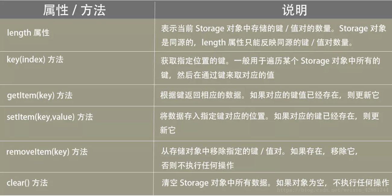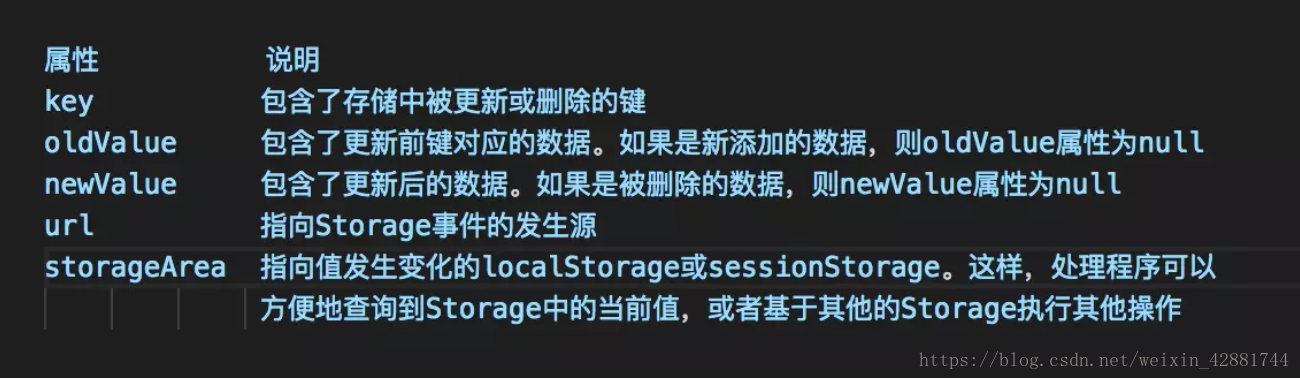 StorageEvent对象在事件触发时,会传递给事件处理程序,它包含了存储变化有关的所有必要的信息。