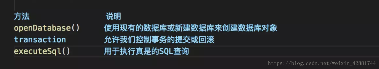 使用transaction()方法传递给回调函数的tx是一个transaction对象,然后使用transaction对象的executeSql()方法,可以执行SQL语句,这里的SQL语句就是创建数据表的命令。