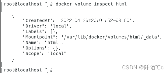 可以看到,我们创建的html这个数据卷关联的宿主机目录为/var/lib/docker/volumes/html/_data目录。