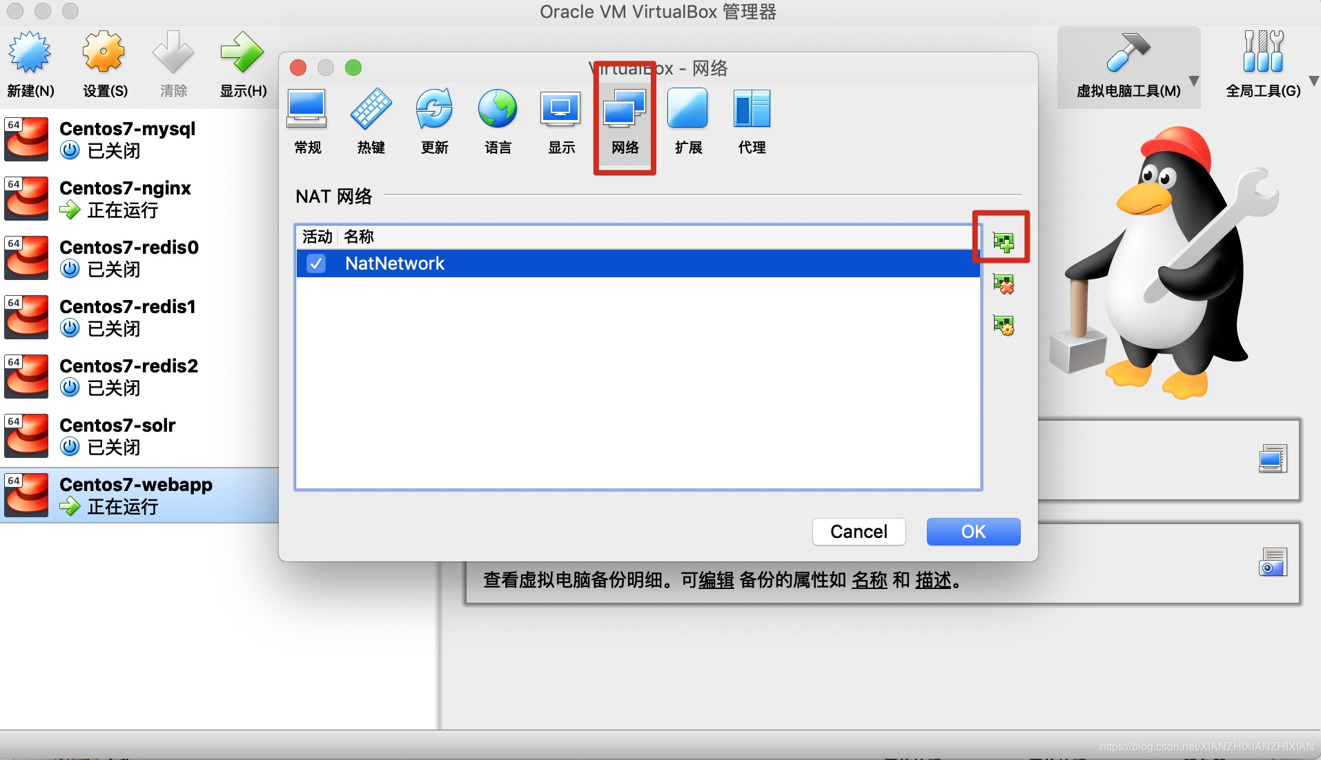 找不到NAT配置的同学可以进入VisualBox :偏好设置 ==> 网络 ==>点击右方添加按钮即可,添加之后基本什么都不用改