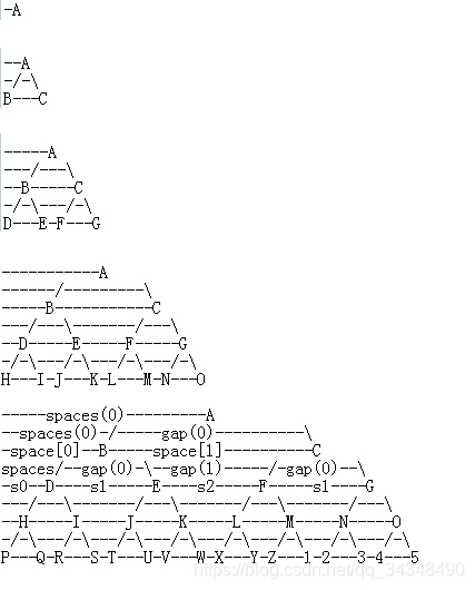 - 再说关系行('/'和'\')的绘制,这里的第一行空格数与上一行的s0有关,而'/'和'\'之间的距离g0知道后,每一对'/'和'\'之间的距离就很容易计算出来了,所以关键是找出g0;