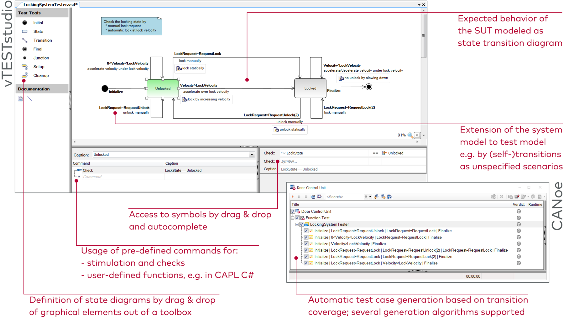 状态图编辑器,可以将ECU的预期行为建模为状态转换图,vTESTstudio会根据测试模型自动生成测试用例,图形元素可以插入与“测试表编辑器”相同的代码,还可以访问信号和变量等