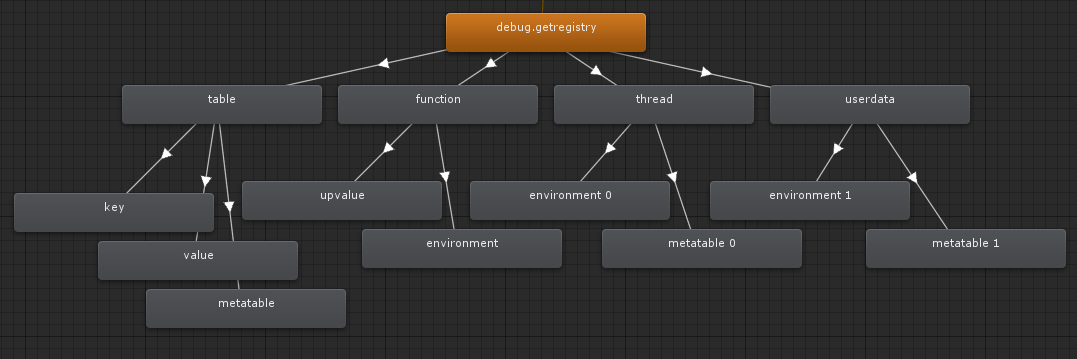 以上资料有各自的参考价值,但是也有些不正确和不符合我要求的地方,一是搜索的根节点不是从 _G 开始,而是从 debug.getregistry 开始,否则你会遗漏很多数据;二是我不想用 c 写,而是直接用 lua 实现,把结果打印到 txt 里。
