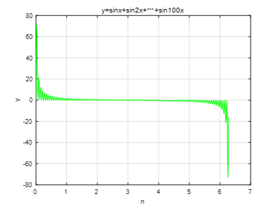 %for循环 x=0:0.01:2*pi,y=0; %定义x的范围 for indx=1:100 y=y+sin(indx*x); end plot(x,y,'g-'); %绘制y的函数图像,并设置线为g(绿色)实线型 title('y=sinx+sin2x+…+sin100x'); %对图像主题的说明 xlabel('n'); %对横轴进行说明 ylabel('y'); %对纵轴进行说明 grid on; %打开图像网格2.实验结果
